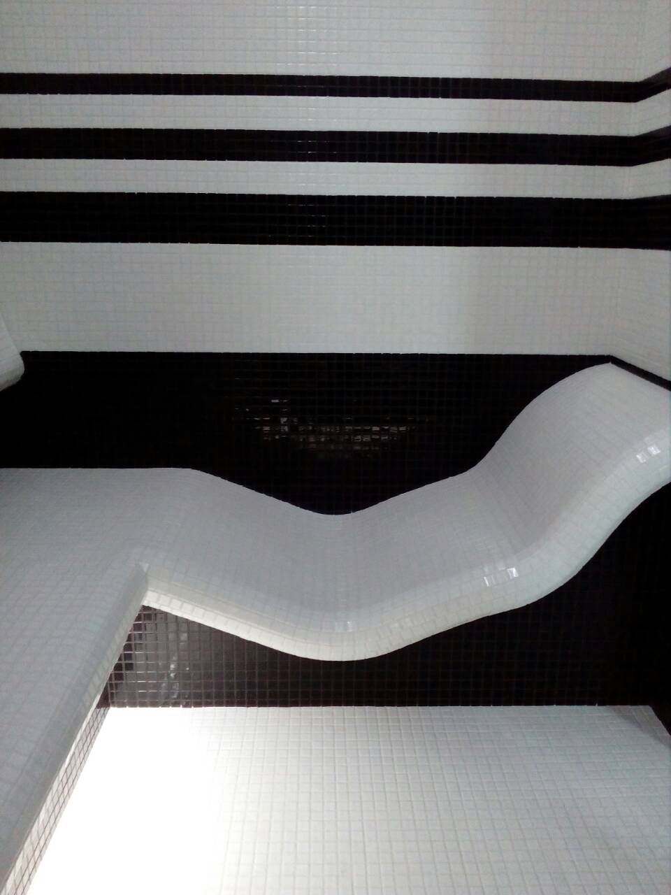 На даном объекте был сделан классический хамам с эргономическим лежаком и лавками с подогревом. Облицовка: мозаика. Дополнительно установлены термо и влаго защищенные динамики. За стеной была обустроена сауна в одном с хамамом стиле.